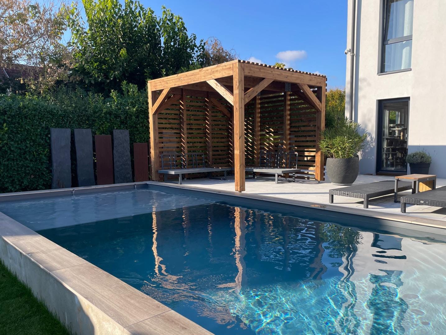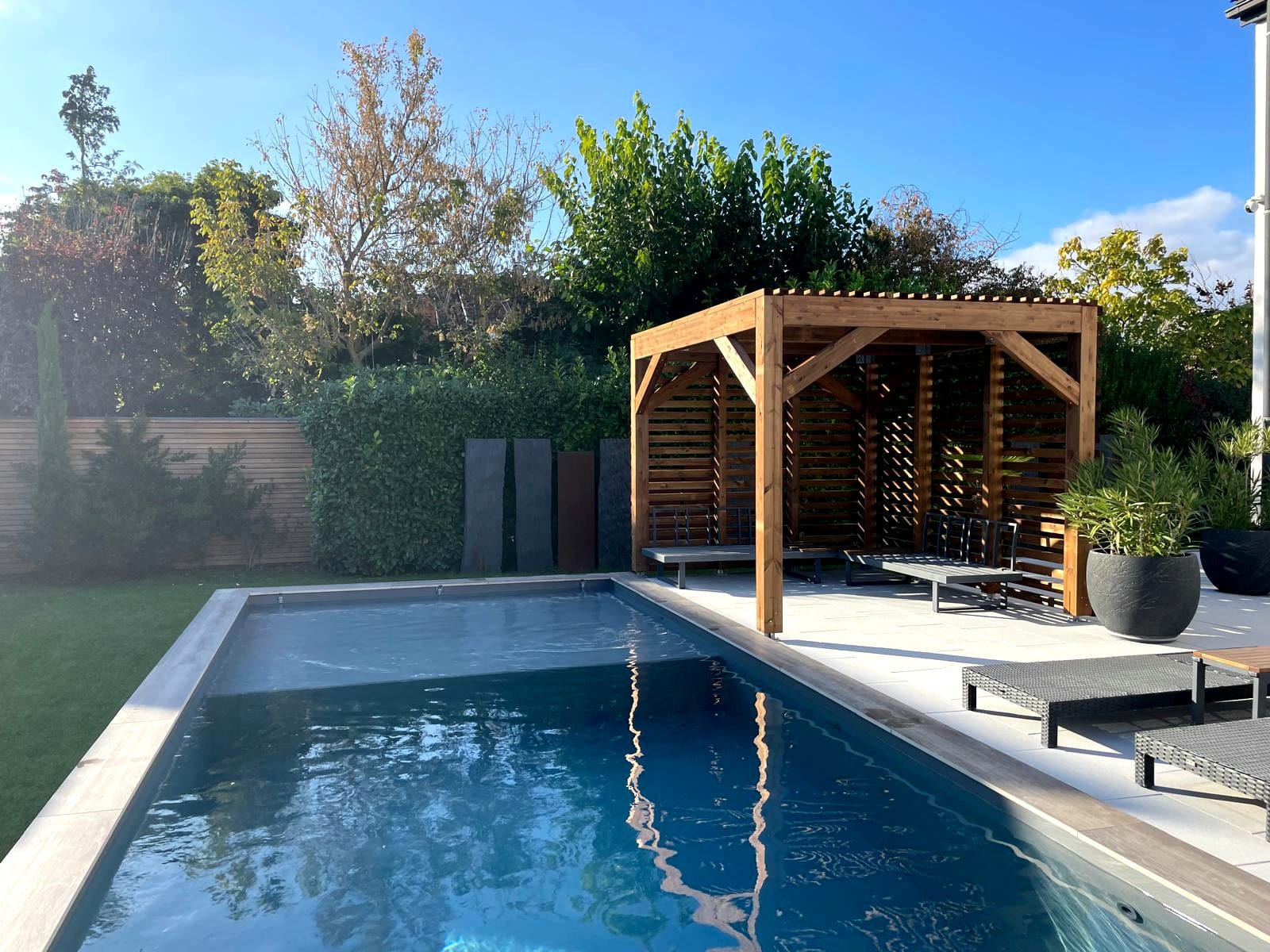 Ainsi, la pergola s’intègre harmonieusement à l’extérieur tout en apportant une touche chaleureuse et naturelle à côté d’une piscine sobre et moderne.