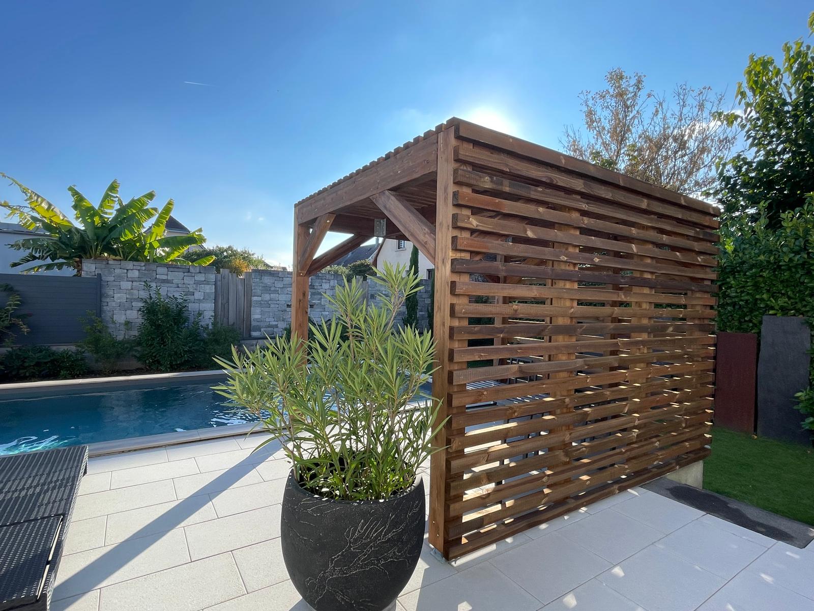 Pour ce chantier situé aux abords de Colmar, le client souhaitait créer un espace à l’abri des UV à proximité immédiate de sa piscine, tout en conservant une cohérence esthétique avec le reste de son extérieur.