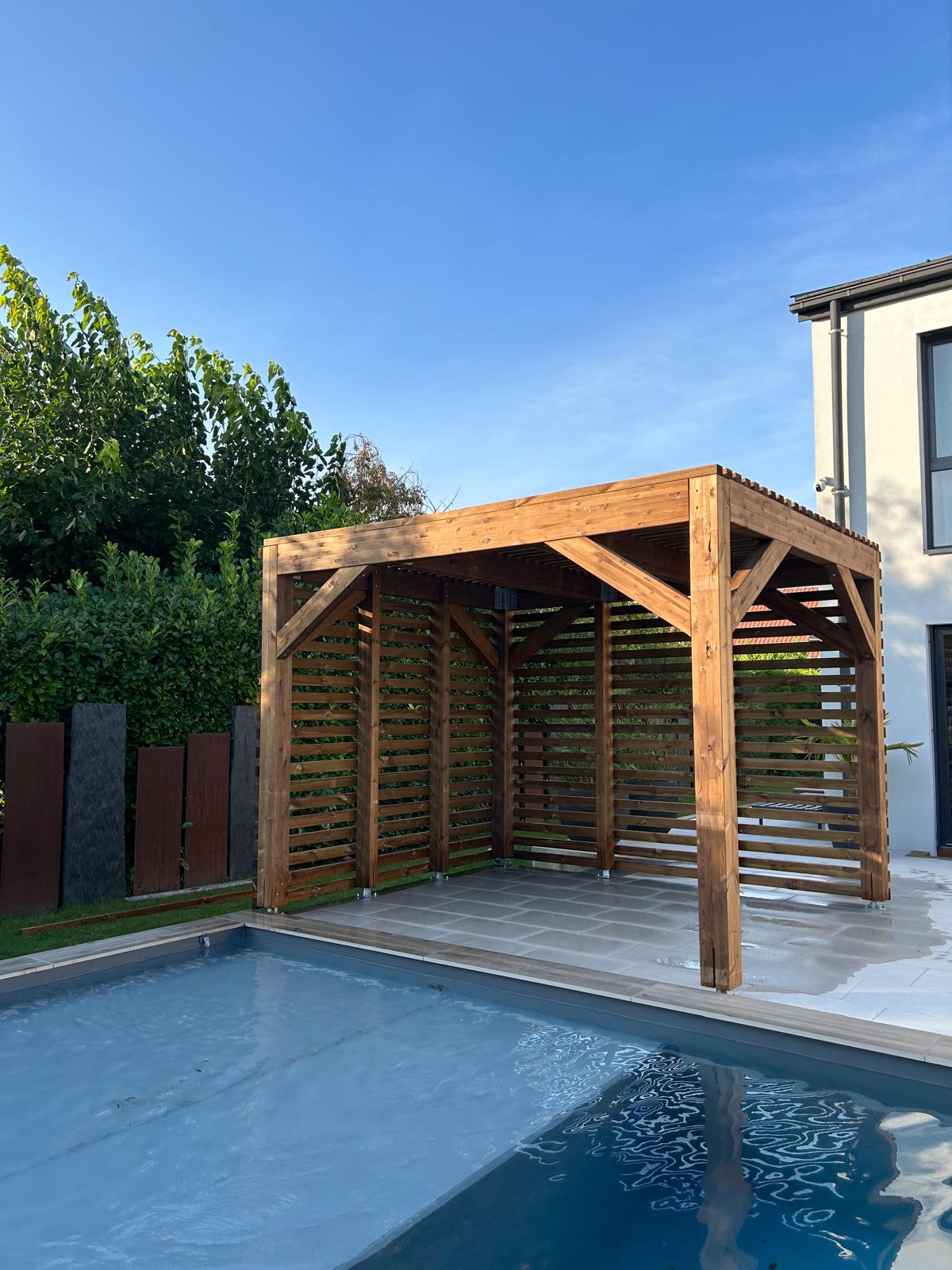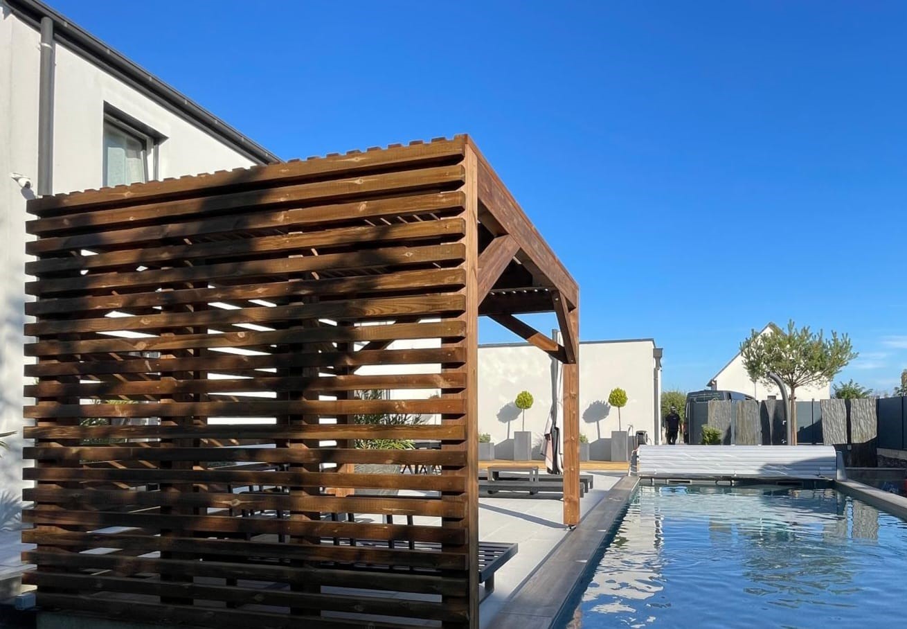 Une fois installée, cette pergola en pin effet brise-soleil transforme l’espace piscine en un véritable lieu de détente et de convivialité.